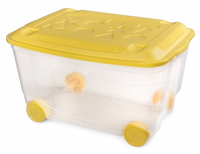 O cutie spatioasa pe roti cu un volum de 45 de litri va fi la indemana in orice camera pentru copii pentru depozitarea jucariilor moi, a seturilor de constructie si multe altele. Manerele convenabile, rotile fiabile si gaurile pentru filetarea cablului fac ca cutia sa fie usor de transportat, chiar si pentru un copil. Capacul luminos este decorat cu forme geometrice care vor interesa cu usurinta un copil care exploreaza lumea din jur. Datorita carcasei transparente din polipropilena absolut sigura, puteti vedea imediat ce este stocat in interior. Si adanciturile speciale de pe capac va permit sa stivati cutiile una peste cealalta.