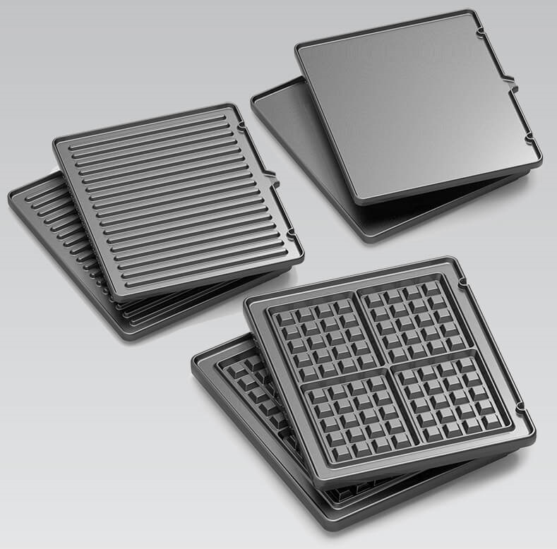 În plustrei seturi de farfurii: gratar, vafe, sandvici