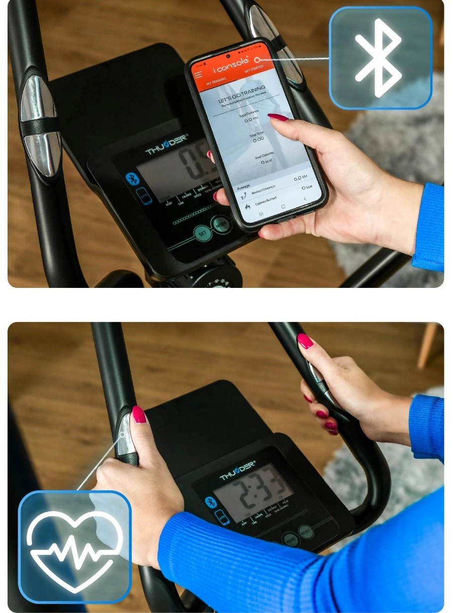 Compatibilitate cu Bluetooth și aplicații mobile – bicicleta eliptică THUNDER® LOOP poate fi conectată la aplicații de antrenament precum iConsole și FitShow, oferind un control mai bun și o analiză detaliată a antrenamentelor.