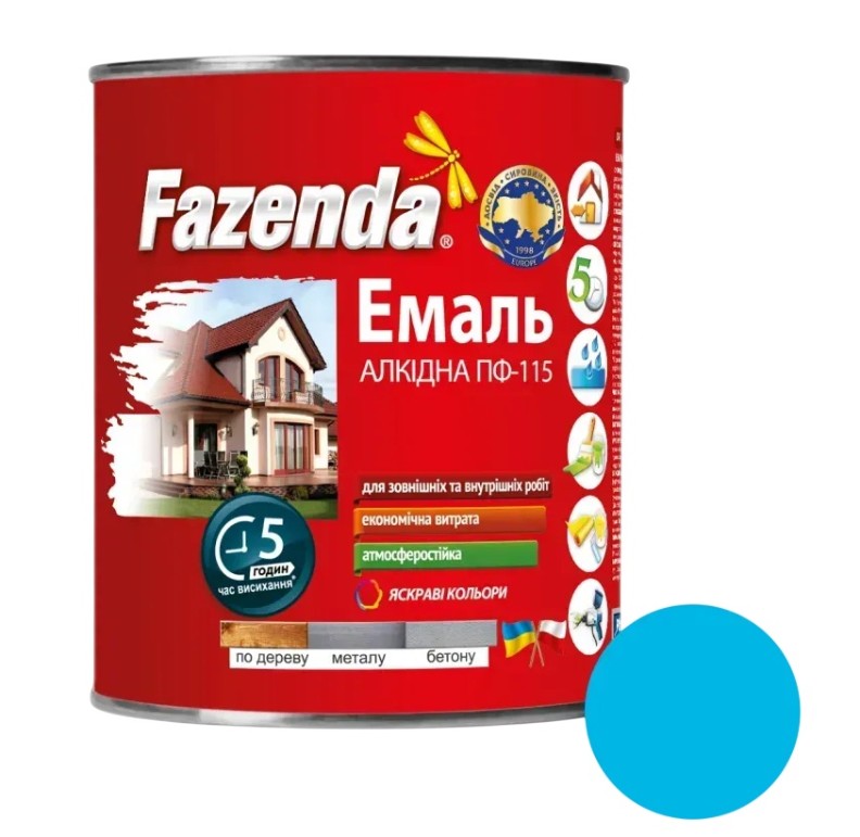 Email Fazenda ПФ-115 Bright Blue — o vopsea alchidică universală pentru vopsirea decorativă și de protecție a suprafețelor metalice și din lemn. Este potrivită pentru uși, garduri, mobilier, rame și alte construcții, atât în interior, cât și în exterior. Asigură un strat uniform și durabil, combinând proprietăți estetice și de protecție.