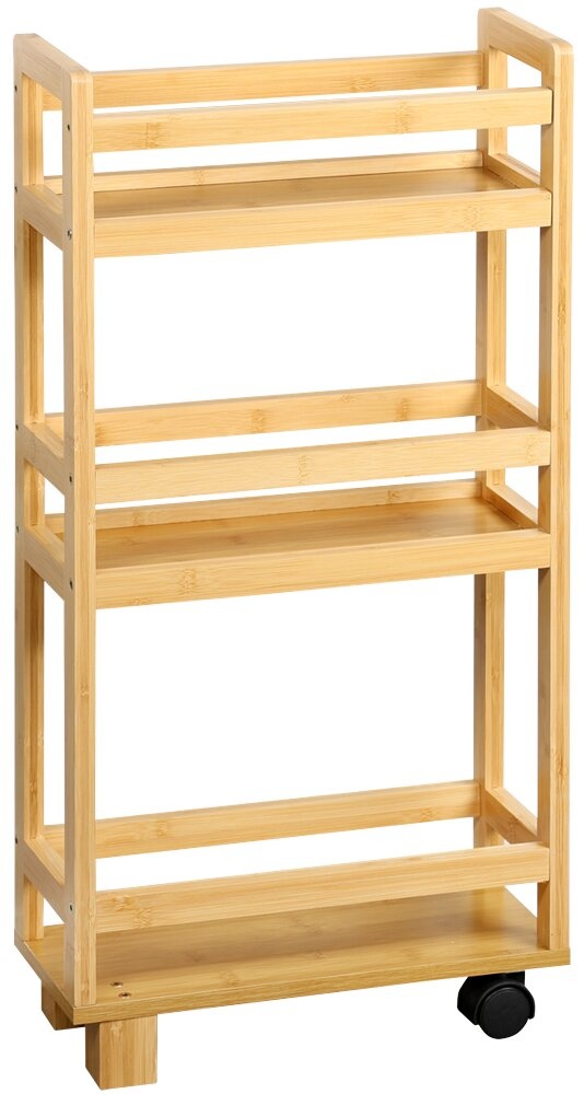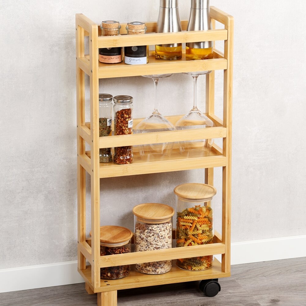 Fabricat din bambus natural, raftul este durabil, stabil și ecologic, oferind o notă caldă și naturală în orice încăpere. Roțile integrate permit repoziționarea rapidă și ușoară, păstrând în același timp stabilitatea raftului atunci când este încărcat.