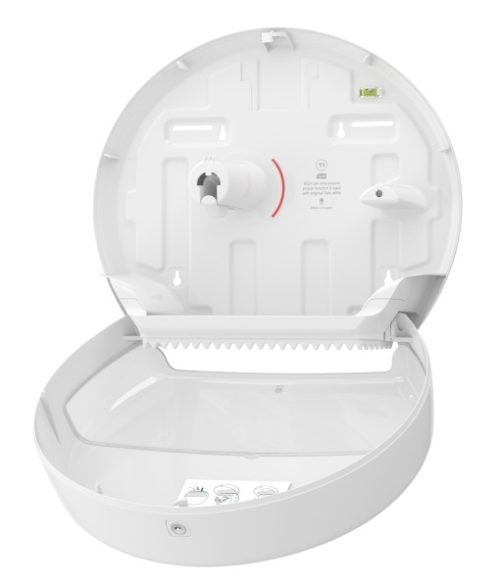 Design modern, functional, usor de curatat. In partea de sus dispune de sistem de blocare cu incuietoare si cheie. In partea de jos are dinti zimzati din fibra de sticla, pentru a rupe hartia cu usurinta. Dispenser cu fereastra semi-transparenta, ce ajuta la monitorizarea consumului, in vederea reincarcarii. Capacitate mare - echivalentul a pana la 8 role conventionale - economiseste timp de intretinere. Reprezinta cea mai buna alegere pentru toaletele cu trafic mic si mediu de utilizatori, cum sunt scolile si institutiile publice. Se prinde in perete cu ajutorul unor suruburi.