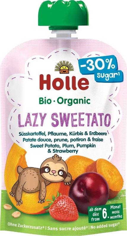Descoperiți piureul Holle's Lazy Sweetato pentru bebelușii cu vârsta de la 6 luni în sus, care conține cu 30% mai puțin zahăr decât alte piureuri!