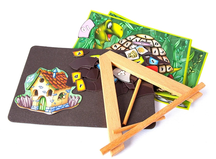 Jocul contine: tabla metalica, 4 imagini de fundal (puzzle casuta, numerele, cuvinte, litere), figuri magnetice stantate si suport din lemn pentru tabla de joc.
