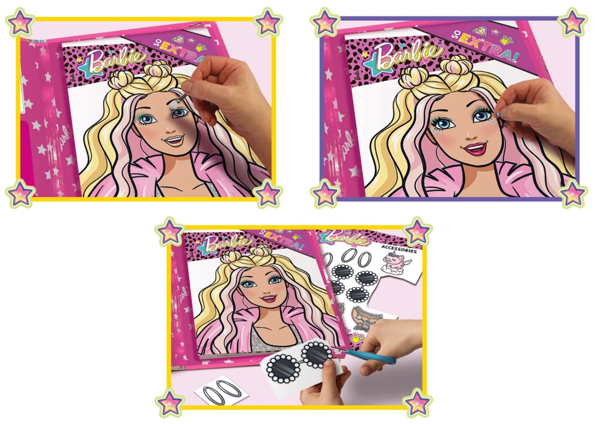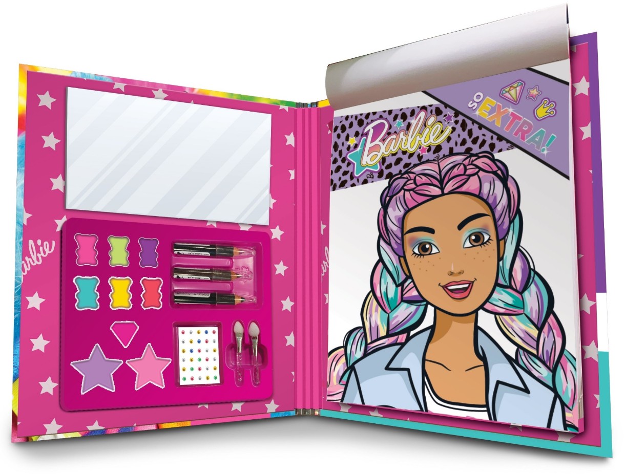 Stăpânește-ți primele tehnici de machiaj cu ajutorul caietului de schițe Barbie. Înăuntru, vei găsi un set de machiaj în stil Barbie Extra. Fetele vor învăța arta machiajului aplicând machiaj păpușilor Barbie din carte și lor însele folosind oglinda inclusă.