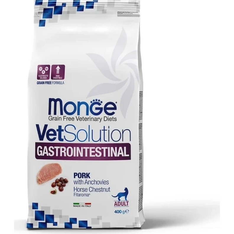 Monge VetSolution Gastrointestinal — hrană completă uscată dietetică din carne de porc pentru pisici „Gastrointestinal” pentru eliminarea simptomelor tulburărilor digestive la pisici. Conține un concentrat de suc de pepene pentru neutralizarea radicalilor liberi. Fit-aroma - castan sălbatic pentru susținerea sănătății intestinale. Xilo-oligosaharide (XOS) pentru protecția microbiotei intestinale și un nivel crescut de sodiu și potasiu și ingrediente ușor digerabile.