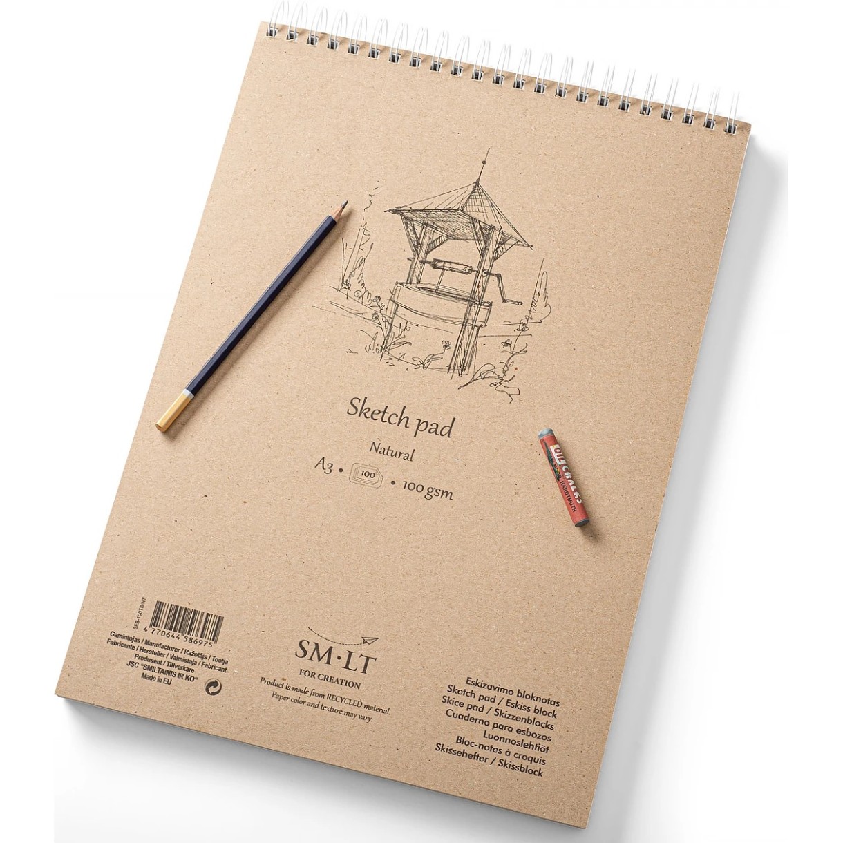 SMLT este ideal pentru schițe și desene realizate în tehnici uscate. Foile albe perforate, cu o densitate de 100 g/mp, sunt protejate în mod fiabil de o copertă rezistentă din hârtie reciclată. Pe partea din spate, albumul este prevăzut cu un suport din carton gros, care poate fi folosit ca planșetă pentru desen în orice condiții.