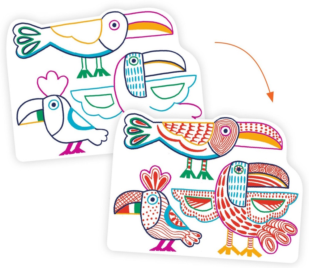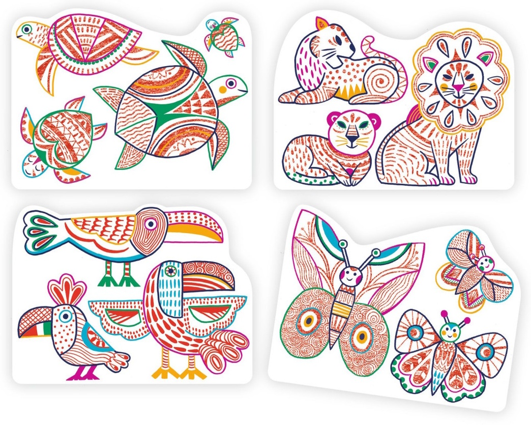 Descoperă magia culorii cu acest set creativ Djeco Wild families DJ00066! Copiii pot colora familii de animale folosind un creion jumbo, care dezvăluie doar anumite zone prestabilite, aducând la iveală modele ascunse și surprize încântătoare pe fiecare pagină.
