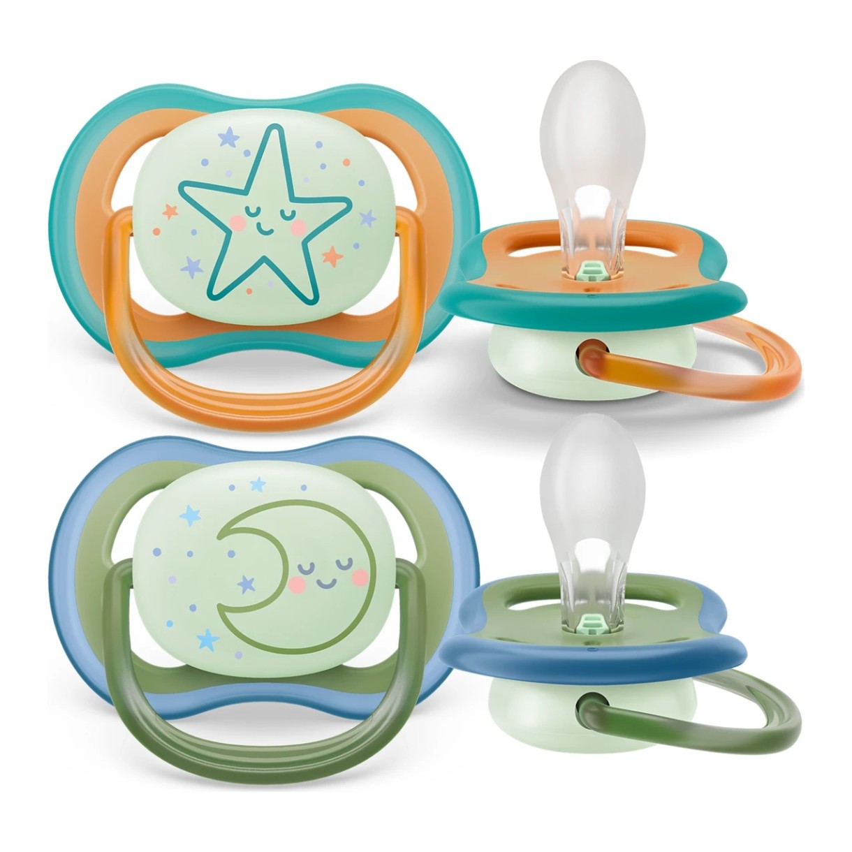 Suzeta care chiar liniștește. Philips Avent Ultra Air este prevăzută cu orificii mari de ventilație pentru a menține pielea bebelușului uscată. Este dotată cu un buton care luminează în întuneric, permițând găsirea ușoară chiar și pe timpul nopții.