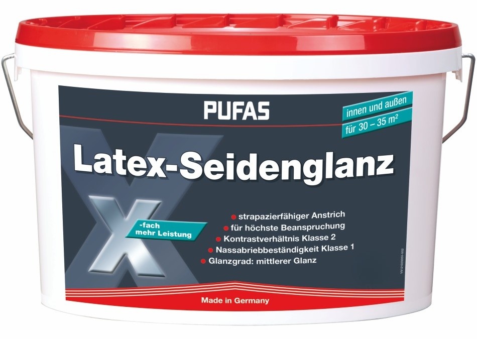 Vopsea semilucioasă acrilică din latex Pufas Latex Seidenglanz, cu putere mare de acoperire și proprietăți de rezistență la intemperii.
