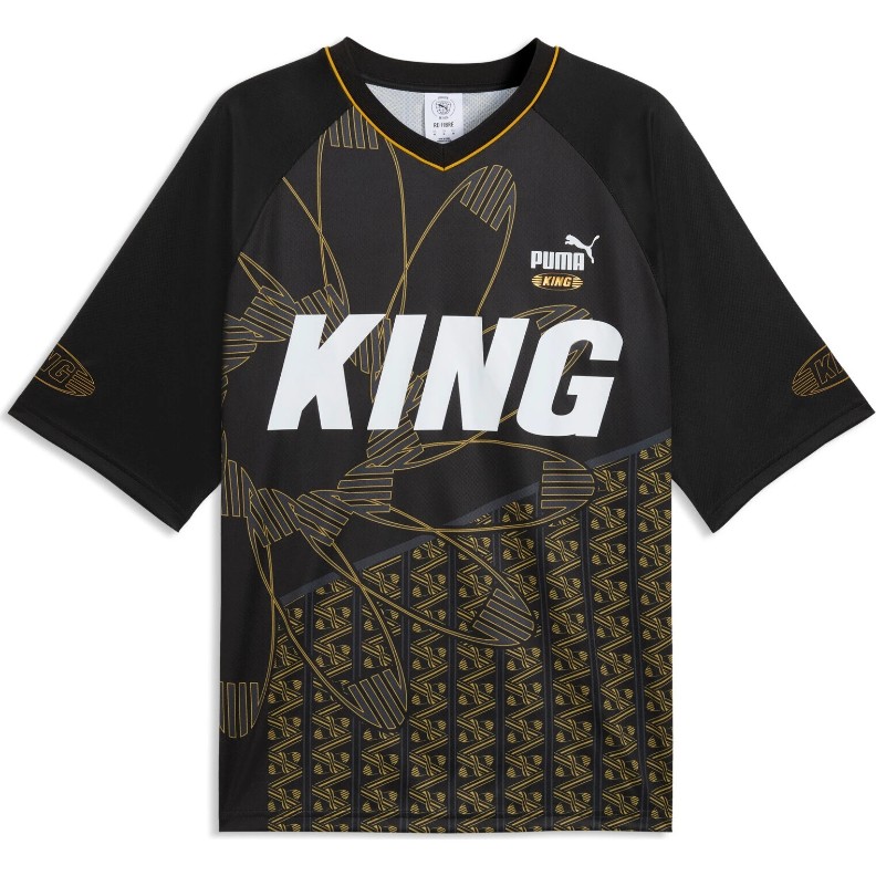 Gâtul elastic în V, cu nervuri, asigură o potrivire îngrijită, iar mânecile raglan oferă libertate deplină umerilor. Imprimeul grafic integral conferă un caracter expresiv, iar logo-urile Puma Cat și King, împreună cu inscripția KING aplicată pe piept, subliniază apartenența la franciza emblematică.