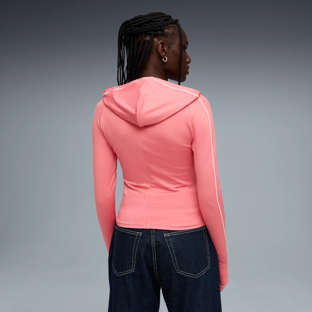 Gluga fixă cu cusături contrastante adaugă caracter și completează designul. Fermoarul bidirecțional pe toată lungimea face modelul practic și ușor de purtat. Mânecile lungi cu orificii pentru degetele mari în manșete fixează potrivirea și adaugă funcționalitate.