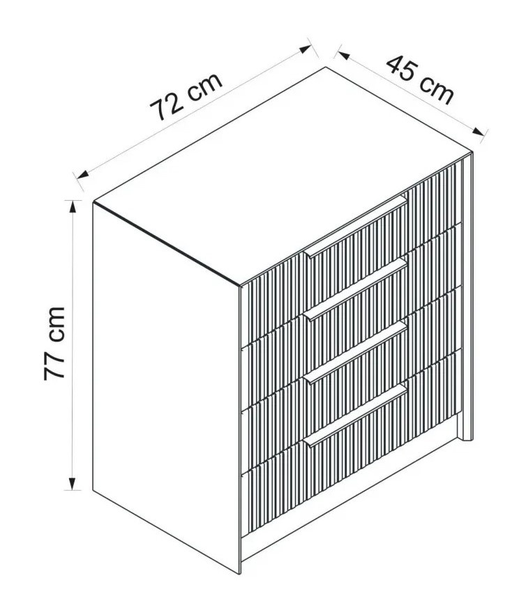 Fabricat din panouri de particule de lemn acoperite cu melamină, comodul nu este doar frumos, ci și durabil. Grosimea de 18 mm asigură stabilitate și robustețe, iar dimensiunile precise îl fac perfect pentru orice dormitor: lățime 45 cm, înălțime 77 cm, adâncime 72 cm.