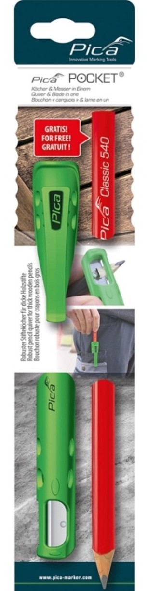 PICA Pocket este o soluție unică pentru problema veche a constructorilor – creionul pierdut. Nu va mai trebui să căutați creionul adânc prin buzunare sau să căutați un cuțit pentru a-l ascuți. Tocul PICA Pocket este prevăzut cu o clemă care se prinde ferm de marginea hainelor, buzunarelor sau gulerului. Tocul este echipat cu o ascuțitoare ascuțită, cu lamă din oțel carbon de înaltă calitate.