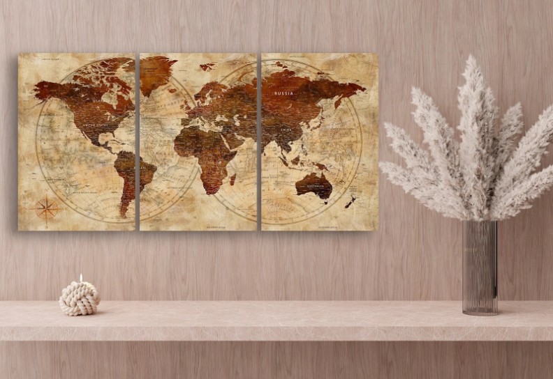Acest tablou modular cu o hartă detaliată a lumii adaugă eleganță și rafinament interiorului. Perfect pentru birou, living sau spații creative, inspiră aventură și călătorii. Imprimat pe pânză de calitate superioară și montat pe șasiu rezistent, oferă un efect vizual remarcabil și durabilitate.