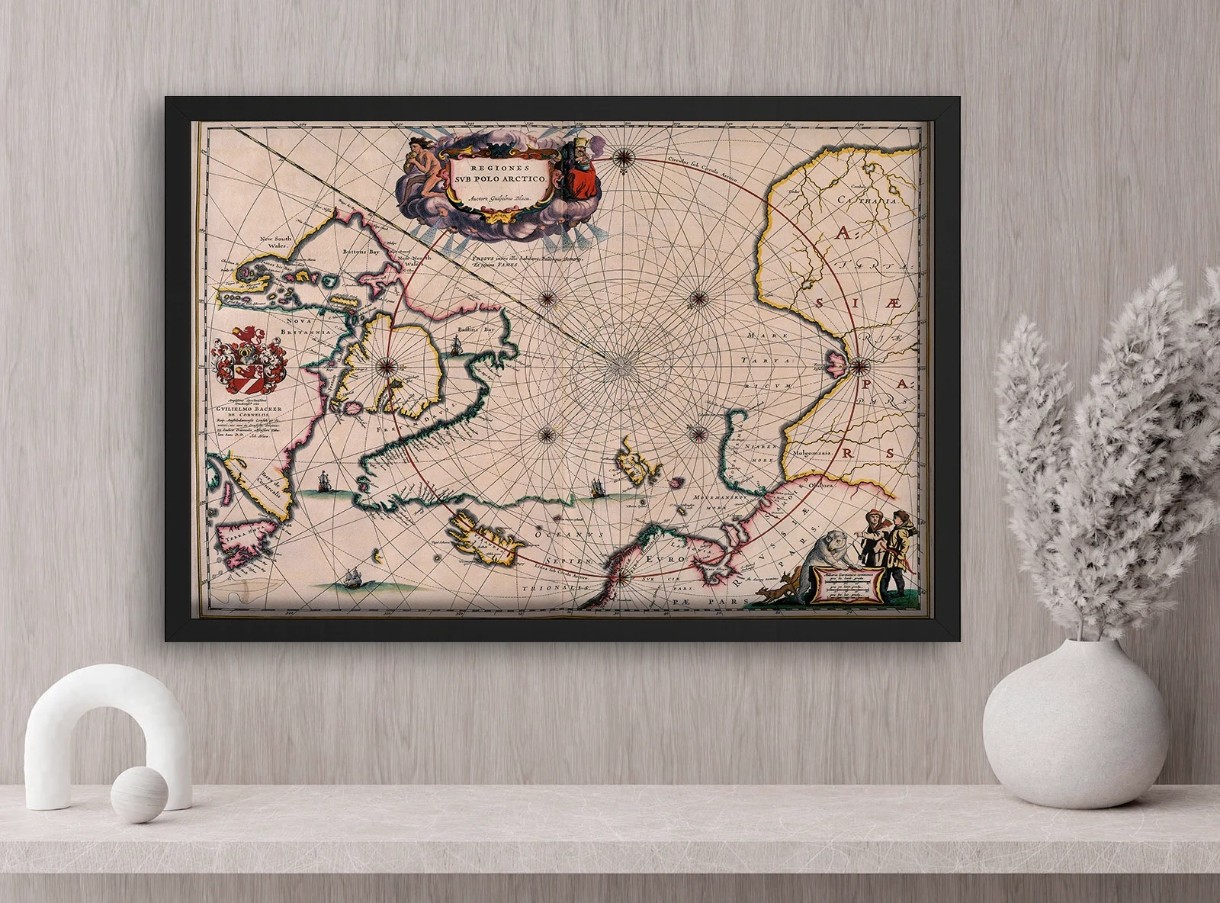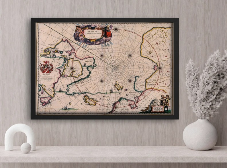 Tablou decorativ cu o hartă veche a regiunilor arctice, bogat detaliată și încadrată elegant într-o ramă albă. Perfect pentru birouri, spații academice sau decor clasic.
