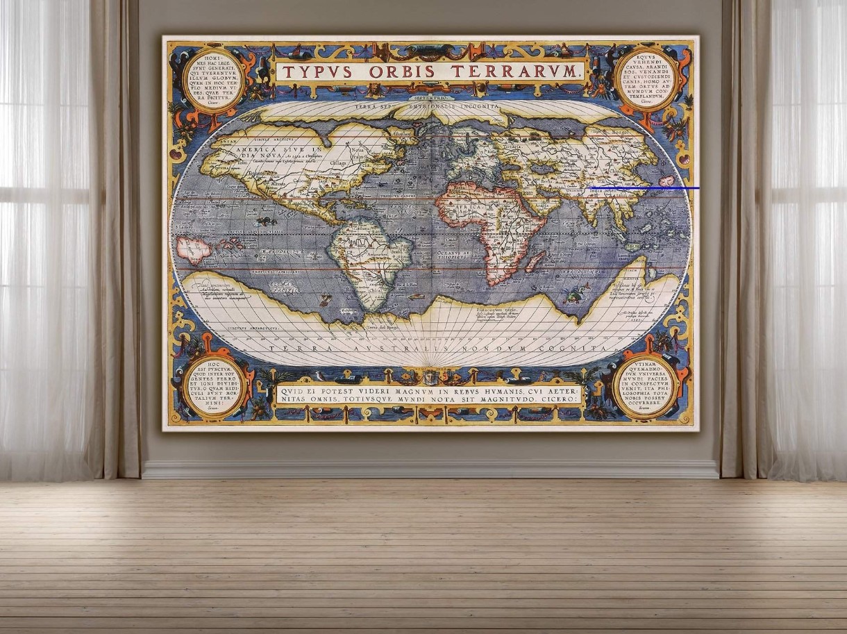 Această hartă a lumii reprodusă în culori clasice adaugă rafinament și profunzime oricărui interior. Un decor perfect pentru spații de lucru, biblioteci sau sufragerii cu tematică clasică sau vintage. Rama albă pune în evidență tonurile calde ale hărții.
