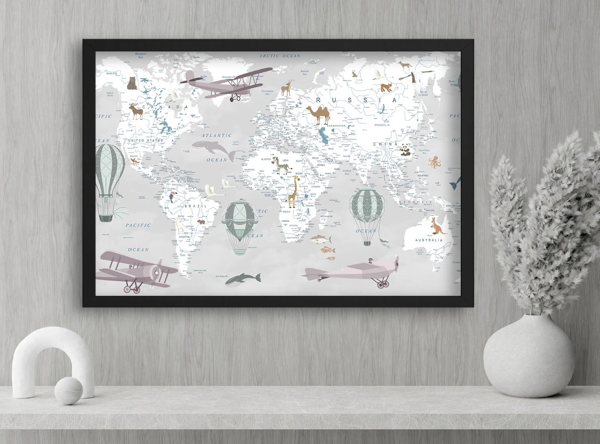 Harta decorativă a lumii pentru copii, cu rame negre elegante, este o alegere minunată pentru decorul camerei celor mici. Fundalul în tonuri deschise este înfrumusețat cu baloane cu aer cald, avioane vintage și animale desenate stilizat, învățându-i pe copii despre continente, oceane și faună într-un mod ludic și estetic. Această hartă educativă nu doar înfrumusețează peretele, ci inspiră curiozitate, visare și dragoste pentru explorare.
