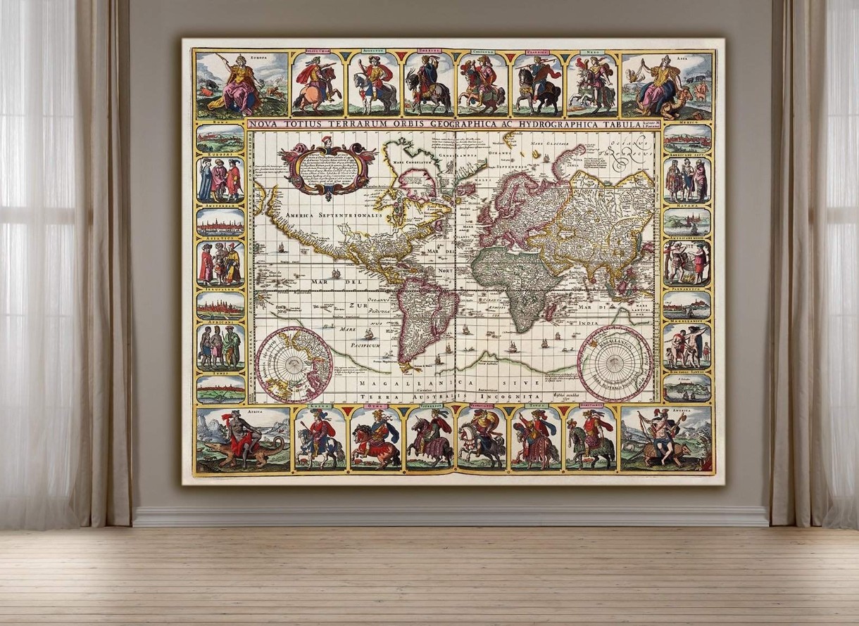 Această hartă antică a lumii este o combinație perfectă între măiestria cartografică și designul artistic. Ramele bogat decorate includ scene mitologice, imagini ale popoarelor lumii, portrete ale exploratorilor și momente istorice, oferind tabloului o profunzime aparte. Detaliile fine ale continentelor, traseelor maritime și busolelor fac ca această piesă să fie nu doar estetică, ci și educativă. Acest poster este ideal pentru decorarea unui birou, a unei biblioteci, a unui spațiu artistic sau a unei cafenele elegante. Printul de înaltă calitate pe pânză păstrează claritatea și intensitatea culorilor pentru mulți ani. Un cadou perfect pentru călători, colecționari și pasionați de istorie!