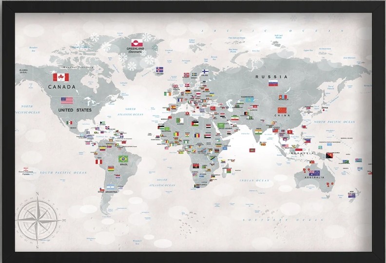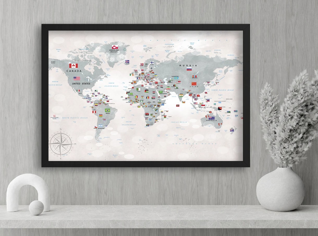 Acest tablou captivant cu hartă politică a lumii și steagurile tuturor țărilor este un instrument educativ valoros și un decor modern în același timp. Fiecare țară este etichetată clar, iar steagurile naționale adaugă o notă vizuală interesantă. Rama albă oferă o eleganță minimalistă care se potrivește atât în camerele copiilor, cât și în birouri, școli sau spații de studiu. Este ideal pentru a învăța geografia lumii într-un mod interactiv și pentru a stimula curiozitatea celor mici despre diferite culturi.