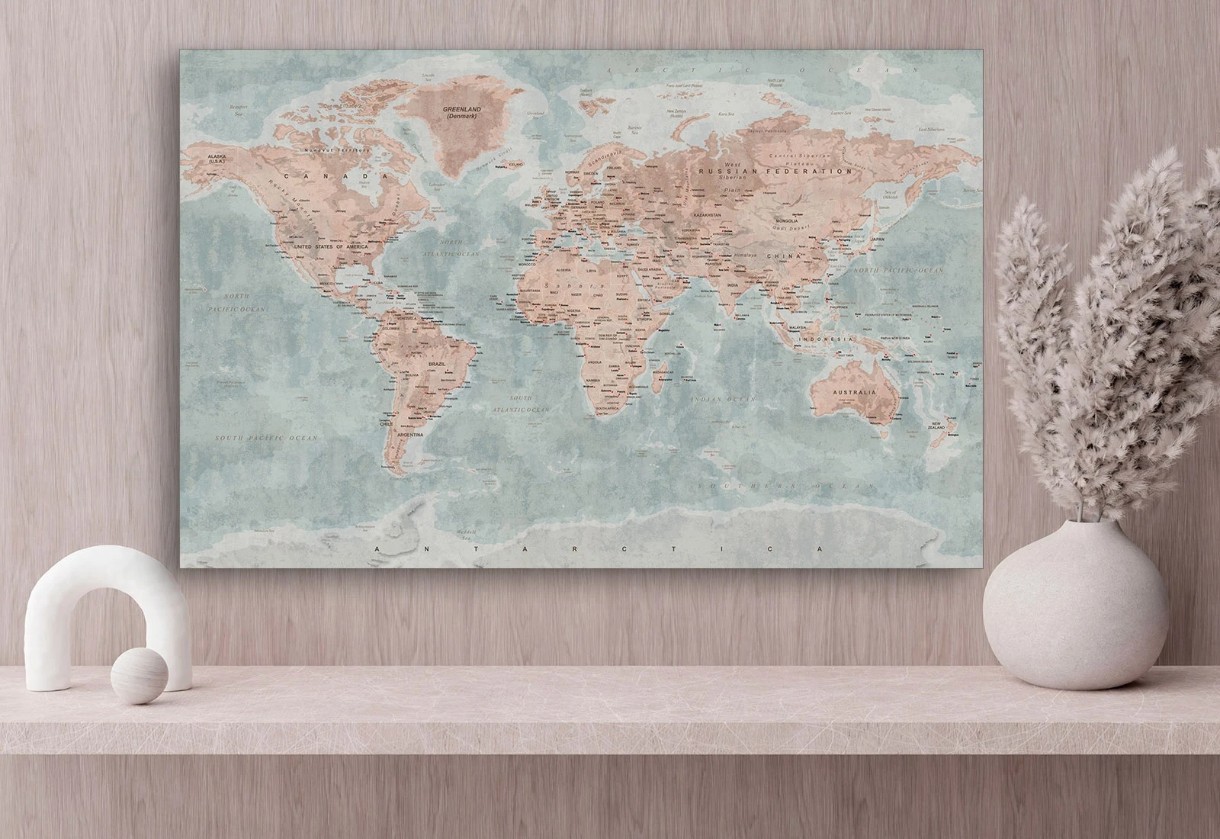 Acest tablou pe pânză redă frumusețea hărților geografice vechi, oferind o atmosferă de aventură și istorie. Tonurile pastelate blânde, textura îmbătrânită artistic și detaliile vintage transformă această hartă într-un element decorativ unic. Harta include numele țărilor, orașelor și oceanelor, fiind ideală atât pentru iubitorii de design clasic, cât și pentru pasionații de geografie. Acest tablou se va potrivi perfect într-un birou, cabinet, sufragerie sau bibliotecă, adăugând un aer aristocratic încăperii. Printul de înaltă calitate pe pânză garantează culori bogate și durabilitate maximă. O alegere perfectă pentru cei care iubesc istoria și eleganța!