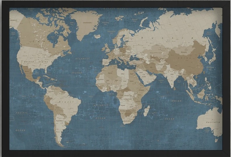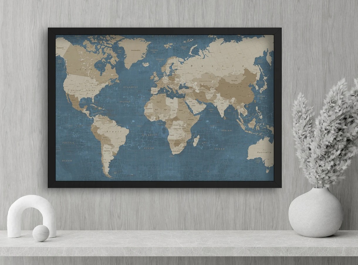 Descoperă eleganța atemporală cu acest tablou decorativ ce înfățișează harta lumii într-un stil vintage rafinat. Fundalul albastru texturat, în contrast cu detaliile bej ale continentelor, creează un efect vizual impresionant, perfect pentru un interior clasic sau modern. Rama neagră oferă o notă sofisticată, ideală pentru birouri, livinguri sau spații academice. Este un cadou excelent pentru pasionații de geografie, călătorii sau design interior, aducând un plus de rafinament și cunoaștere în orice încăpere.