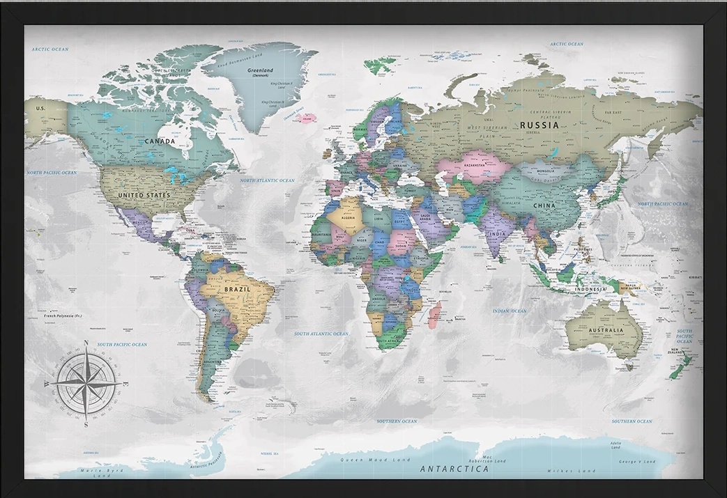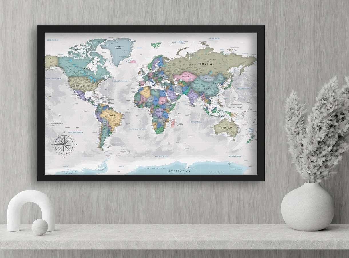 Un tablou elegant cu hartă politică a lumii în culori vibrante, ideal pentru decorul modern al biroului sau camerei copiilor. Fiecare țară este ilustrată clar, cu delimitări bine definite, ceea ce îl transformă într-un suport vizual educativ și atrăgător. Rama neagră adaugă un accent stilat, făcând acest poster potrivit atât pentru spații de lucru, cât și pentru camerele celor mici pasionați de geografie. Tipărit pe materiale de calitate, este un cadou perfect pentru iubitorii de explorare și educație.