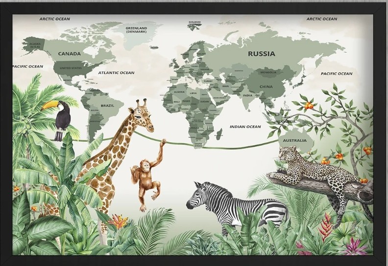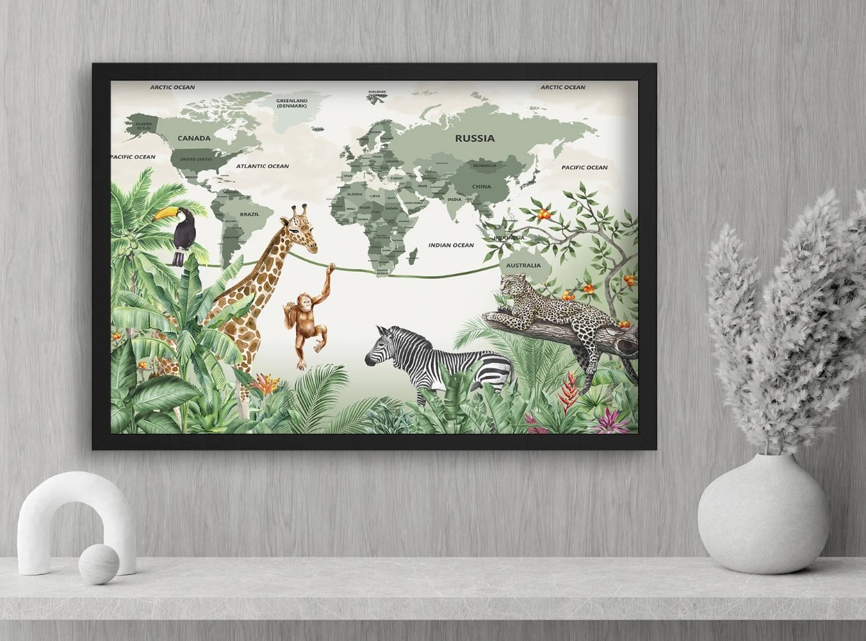 Acest tablou adorabil cu hartă a lumii este înfrumusețat cu animale exotice din junglă precum girafe, maimuțe, zebre și tucani, oferind copiilor o experiență vizuală educativă și distractivă. Ideal pentru camera celor mici, stimulează curiozitatea și interesul față de geografie și natură. Fundalul delicat și culorile naturale se integrează perfect în orice decor modern sau tematic. Cu ramă neagră și print de calitate, acest poster este alegerea perfectă pentru părinți care doresc să combine învățarea cu estetica.