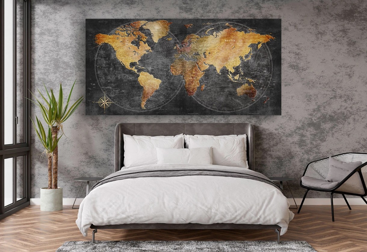Acest tablou cu harta lumii în stil vintage impresionează prin contrastul dintre nuanțele calde ale continentelor și fundalul întunecat elegant. Este ideal pentru a adăuga un aer sofisticat și intelectual în birou, sufragerie sau chiar într-un spațiu de lucru creativ. Designul său clasic se potrivește perfect cu interioarele moderne și retro, oferind un punct focal aparte și transformând orice perete într-o piesă de conversație. Perfect ca idee de cadou pentru pasionații de călătorii și exploratori ai lumii.