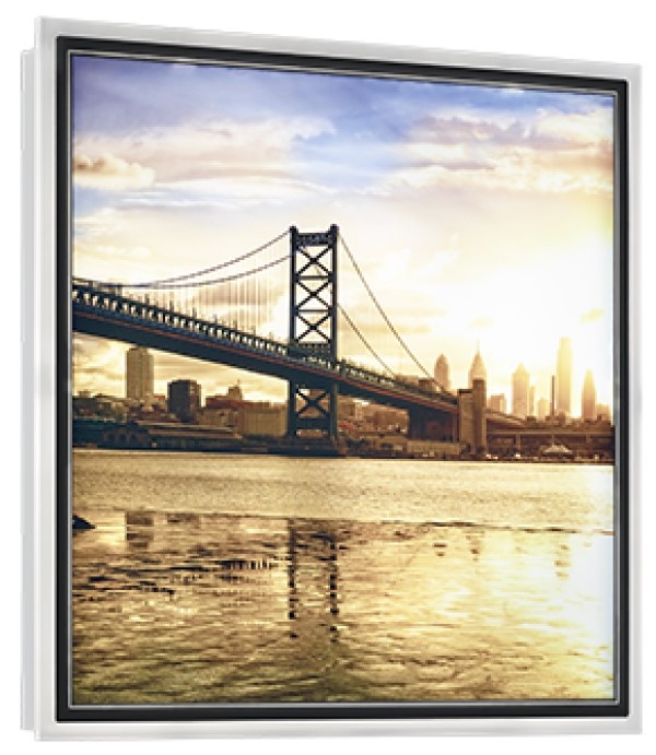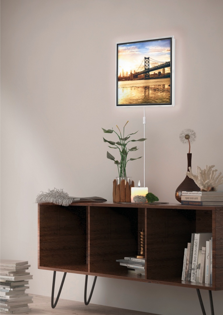 Un alt avantaj al aplicației BRIDGE este funcția FLEXconnect, care permite instalarea fie direct în perete, fie prin cablu prelungitor, oferind flexibilitate în amplasare. Combinația contrastantă de culori inspirate din cer și apă creează o imagine armonioasă și expresivă.