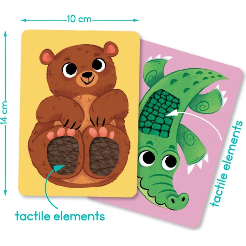Include 10 carduri tactile mari (dimensiunea unui card 14×10 cm) cu texturi care stimulează dezvoltarea senzorială, motricitatea fină și sensibilitatea tactilă, ajutând în același timp copiii să recunoască animalele și să își extindă vocabularul într-un mod captivant.