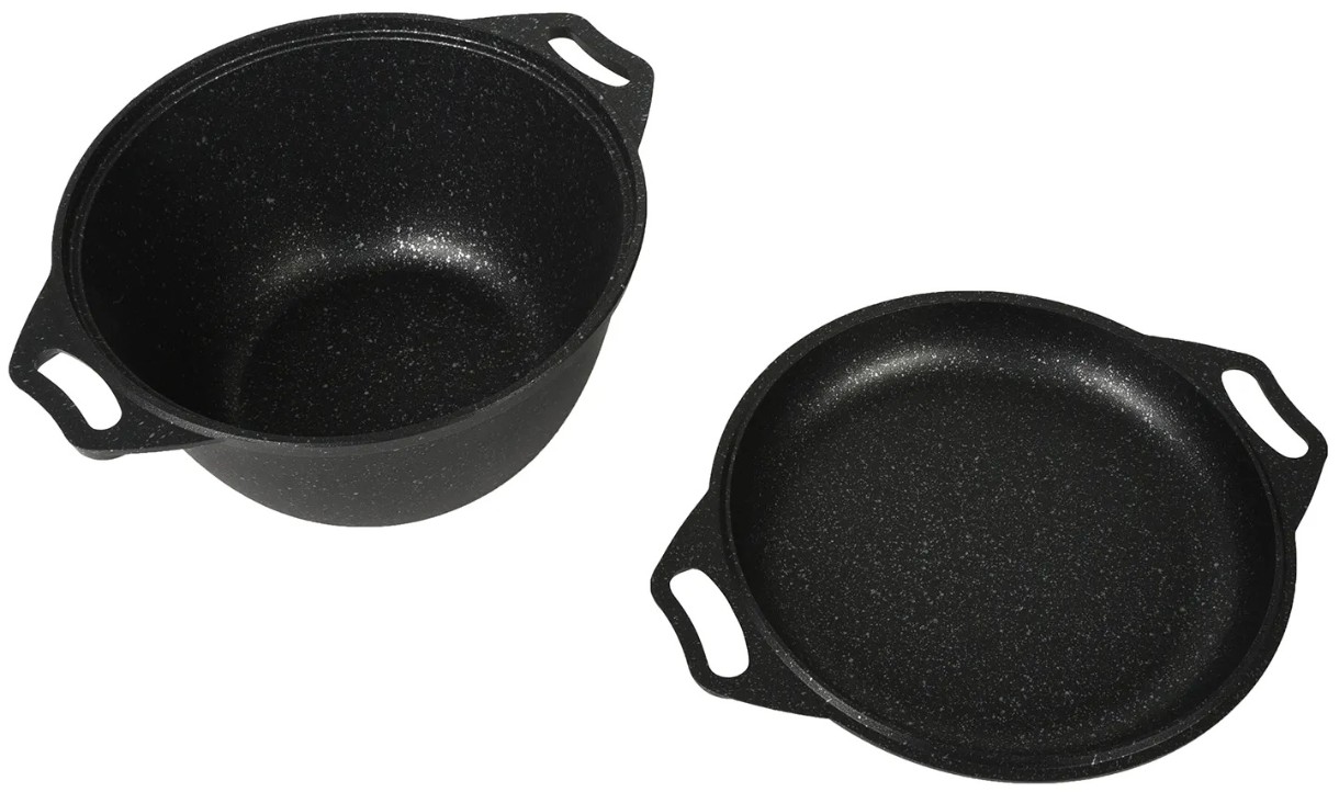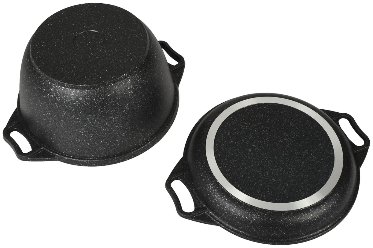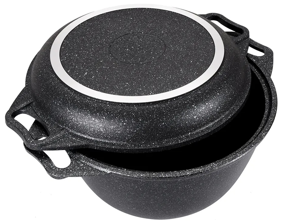 Un avantaj deosebit îl reprezintă capac-tigaia, realizată din aluminiu și acoperită cu strat antiaderent pe ambele fețe. Aceasta poate fi folosită separat ca tigaie pentru sotarea legumelor sau prăjirea bucăților de carne. Stratul antiaderent marmorat de nouă generație, întărit cu particule naturale de piatră, este extrem de rezistent la uzură, ușor de curățat și sigur pentru sănătate. Permite gătitul cu o cantitate minimă de ulei, păstrând totodată aspectul impecabil al vasului timp îndelungat.