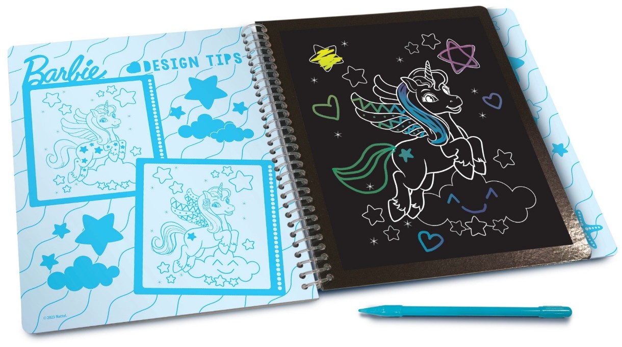 Descoperă magia culorilor cu noul efect de răzuit Barbie. Folosește stiloul inclus pentru a răzui stratul superior negru al foii și a dezvălui culori vibrante ale curcubeului cu nuanțe fantastice, mult sclipici și ornamente aurii.