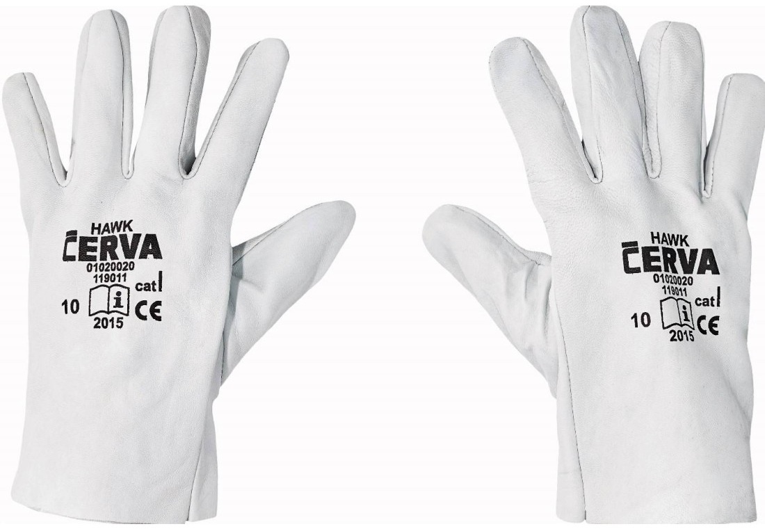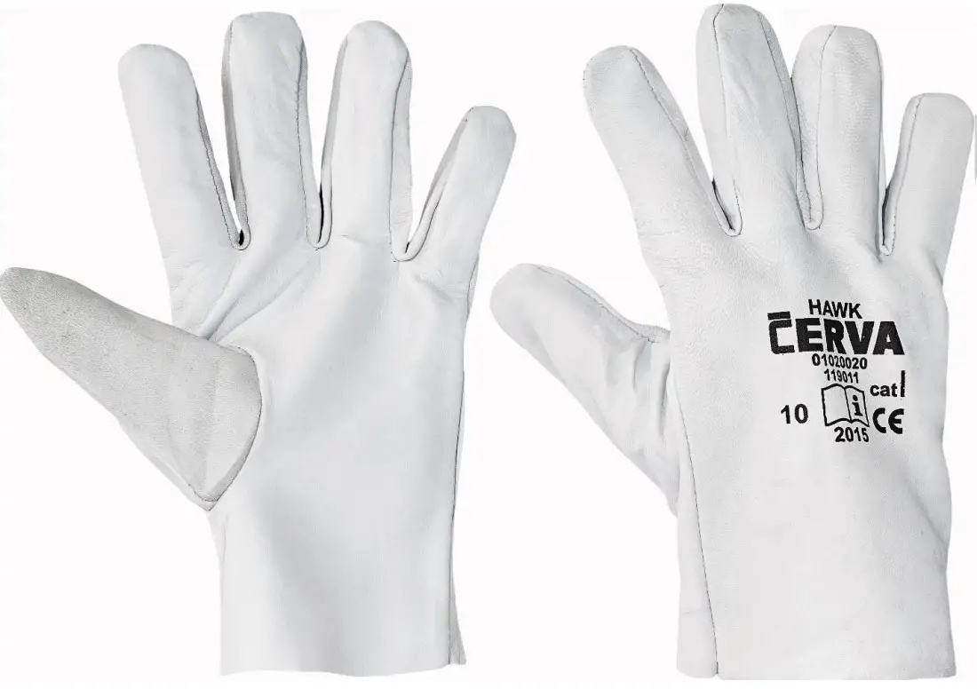 Mănușile HAWK de la Cerva sunt confecționate din piele moale de capră albă, fără manșetă. Aceste mănuși oferă protecție pentru activități generale și mai puțin periculoase, incluzând industria auto și service, construcții și amenajări, grădinărit, agricultură, silvicultură, piscicultură și vânătoare, industria lemnului și a mobilei, industria ușoară, logistică, transport și telecomunicații. Mănușile respectă standardul EN 420 „Mănuși de protecție. Cerințe generale și metode de testare”, care stabilește cerințele privind proiectarea și fabricarea mănușilor, rezistența la permeabilitatea apei, siguranța, confortul, eficiența, marcarea și informațiile oferite de producător. Acest standard poate fi aplicat și protecțiilor pentru brațe și mănușilor conectate permanent cu carcasa de protecție. Pielea moale asigură confort și o potrivire bună, făcând mănușile ideale pentru utilizarea îndelungată.