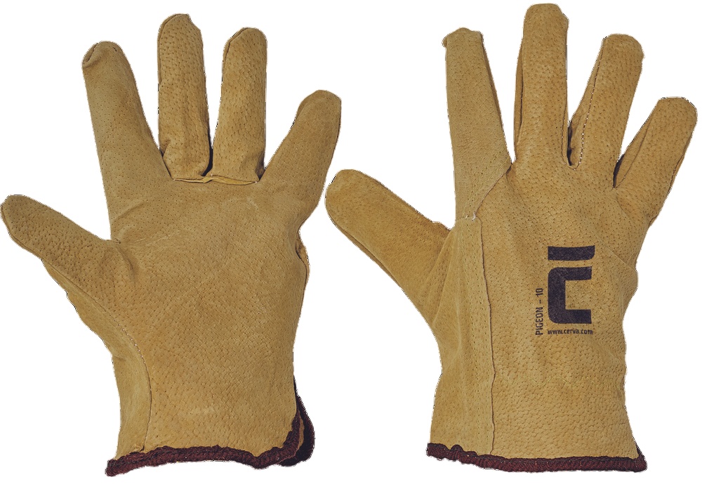 Mănușile Cerva PIGEON sunt confecționate integral din piele spalt de porc, inclusiv manșeta, tot din piele de porc. Mănușile nu au căptușeală și sunt prevăzute cu inserție (gore) la nivelul încheieturii pentru flexibilitate și confort. Manșeta este tip slip-on. Respectă standardele EN ISO 21420 și EN 388 (2111X). Aceste mănuși sunt destinate ingineriei și oferă confort, protecție sigură și potrivire bună pentru diferite activități de lucru.