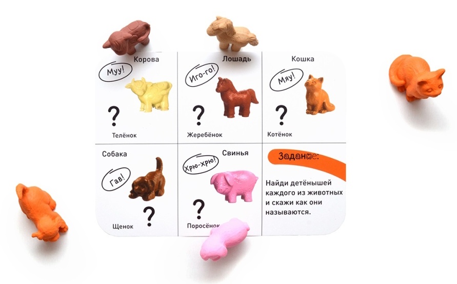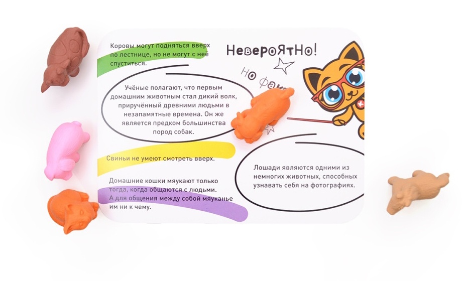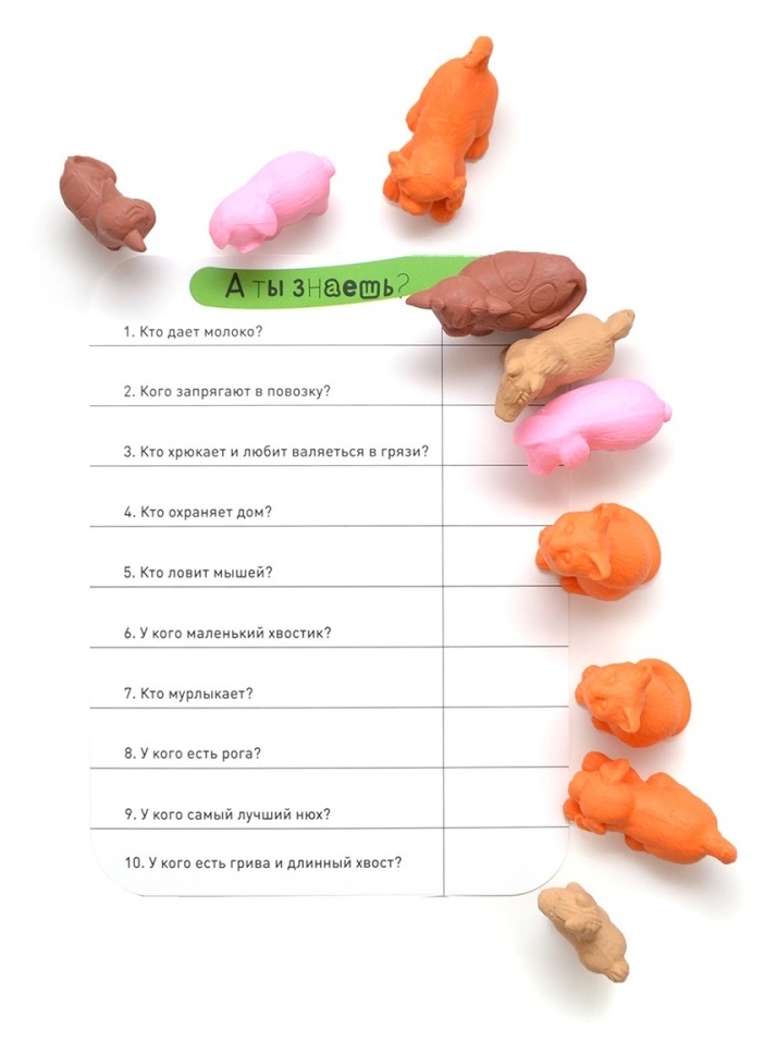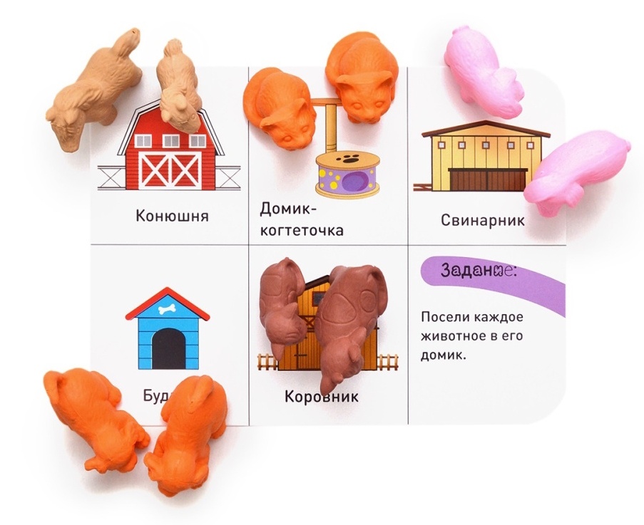 Setul educativ „Animalele domestice” include 10 figurine de animale și 6 cartonașe cu sarcini. Prin îndeplinirea sarcinilor, copilul își antrenează memoria, dezvoltă interesul cognitiv, atenția și logica. Figurinele de animale realizate dintr-un material plăcut la atingere vor masa ușor degetele și vor contribui la dezvoltarea abilităților motorii fine.