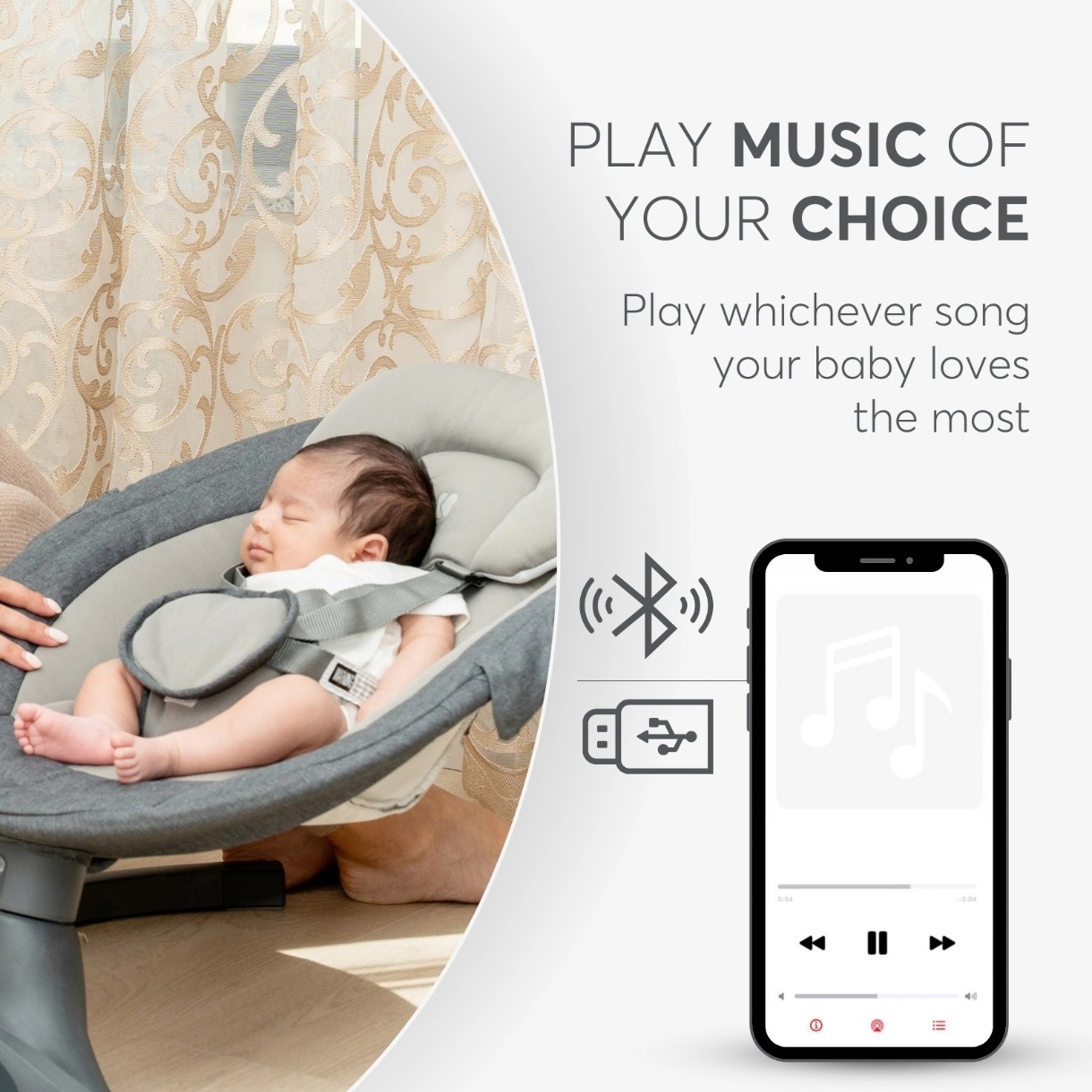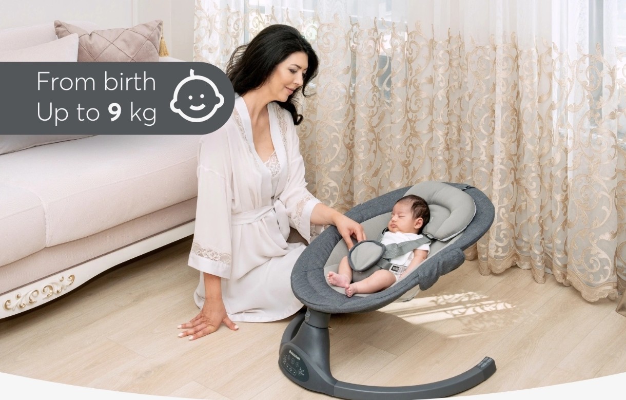 - Funcționare silențioasă: Mișcare lină și fără zgomot, ideală pentru a calma bebelușul fără întreruperi.