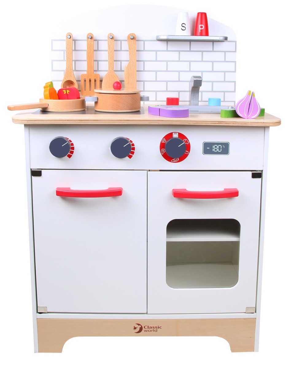 Copilul dvs. se va bucura să joace cu această bucatarie elegantă, simplă și modernă. Copiii se vor distra pregătind mâncare delicioasă pentru toata familia. Deschideți robinetul pentru a „spăla” fructele și legumele, apoi „găti” cu ingrediente gata. Bucătăria roz oferă copiilor toată experiența de a fi un mic bucătar. Jucăria este fabricată din lemn natural, pentru producerea ei se folosesc vopsele sigure.