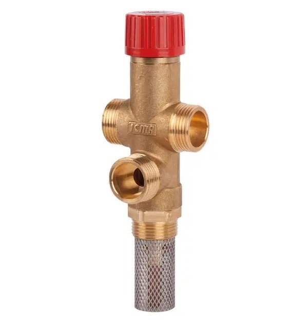 Supapă de supraîncălzire termică. Previne supraîncălzirea cazanelor pe combustibil solid. La 95°C, supapa se deschide și alimentează cazanul cu apă rece.