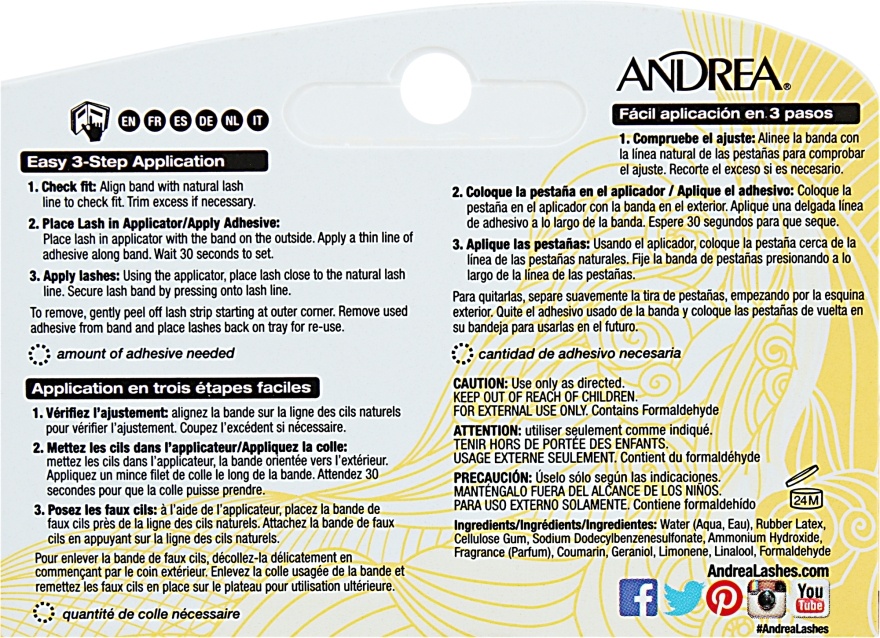 Mod de utilizare: Pentru ca genele false să arate mai naturale, acestea ar trebui să fie doar puțin mai întunecate decât naturale. Înainte de a le aplica pentru prima dată pe pleoapele superioare, este necesar să scurtați cilii, care se vor «întinde» pe marginile pleoapelor orientate spre nas. Aplicați o cantitate mică de clei pe banda de gene, apăsați ușor pe gene sau pe piele și lăsați să se usuce ușor.