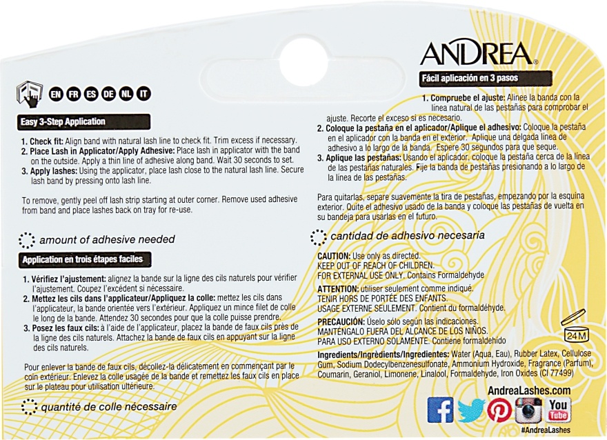 Mod de utilizare: Pentru ca genele false să arate mai naturale, acestea ar trebui să fie doar puțin mai întunecate decât naturale. Înainte de a le aplica pentru prima dată pe pleoapele superioare, este necesar să scurtați cilii, care se vor «întinde» pe marginile pleoapelor orientate spre nas. Aplicați o cantitate mică de clei pe banda de gene, apăsați ușor pe gene sau pe piele și lăsați să se usuce ușor.