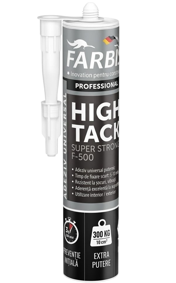 Adezivul Farbis High Tack F-500 Extra-Strength este un adeziv și etanșant universal, alb, pe bază de polimeri MS cu tehnologie hibridă. Este deosebit de puternic, cu o aderență inițială foarte rapidă de 5 secunde. Este cel mai puternic dintre toți adezivii, cu o capacitate de încărcare de până la 300 kg.