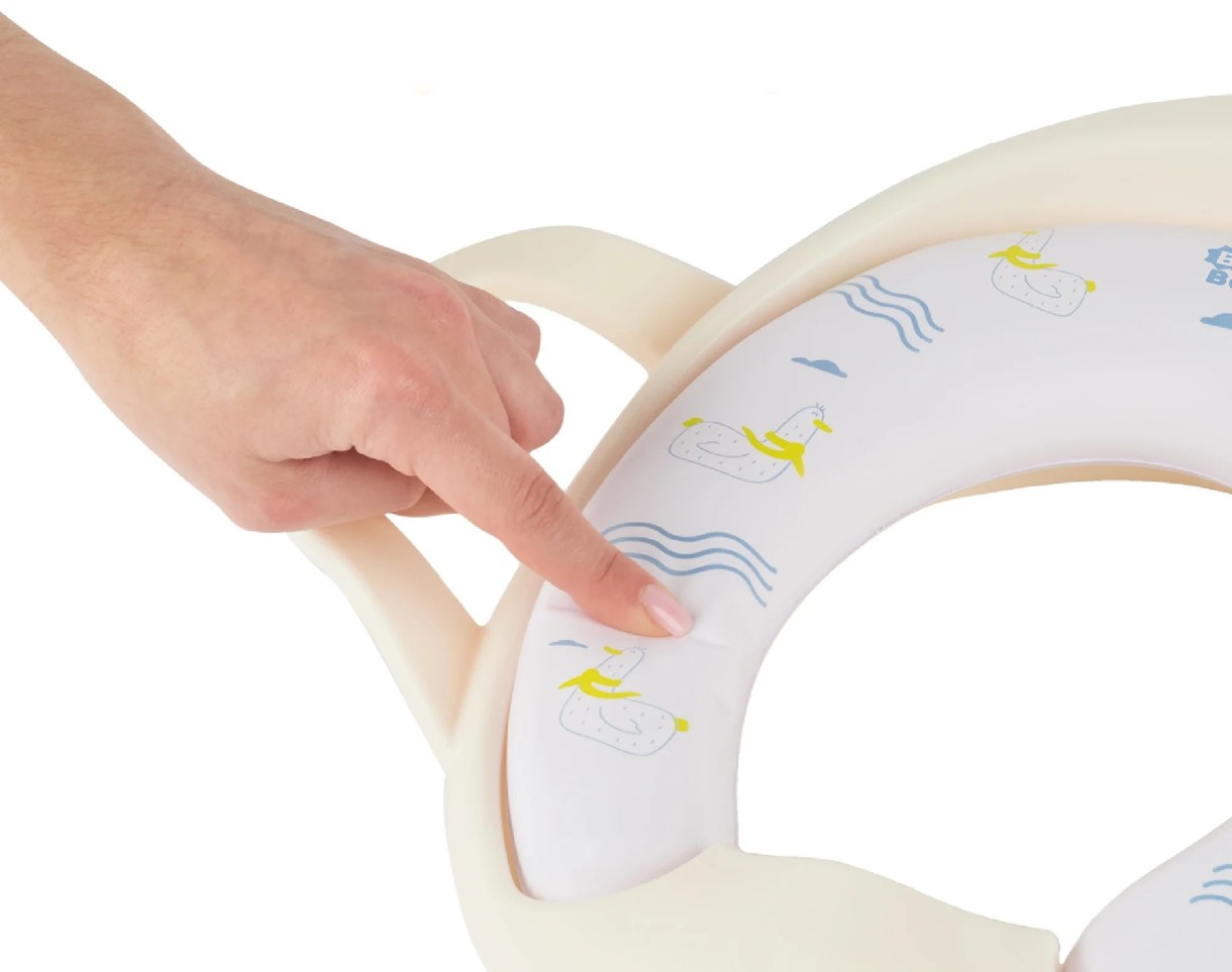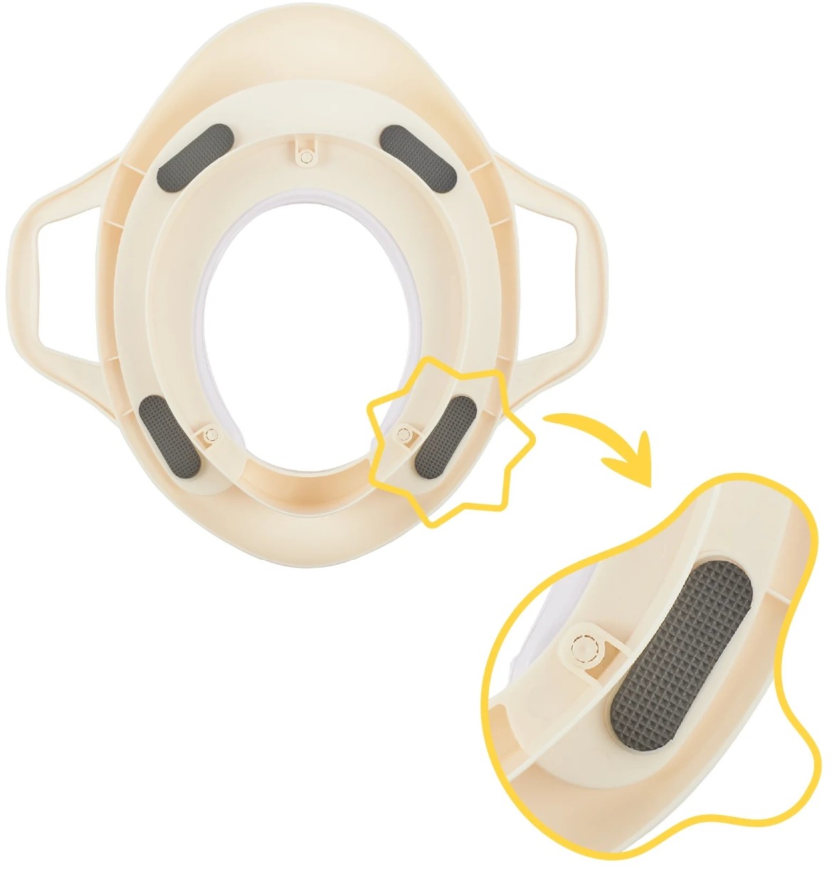 Pe laterale are mânere de siguranță, de care copilul se poate ține pentru mai multă stabilitate și încredere. Sistemul antiderapant și inserțiile din cauciuc ajută la fixarea sigură pe vasul de toaletă, prevenind alunecarea.