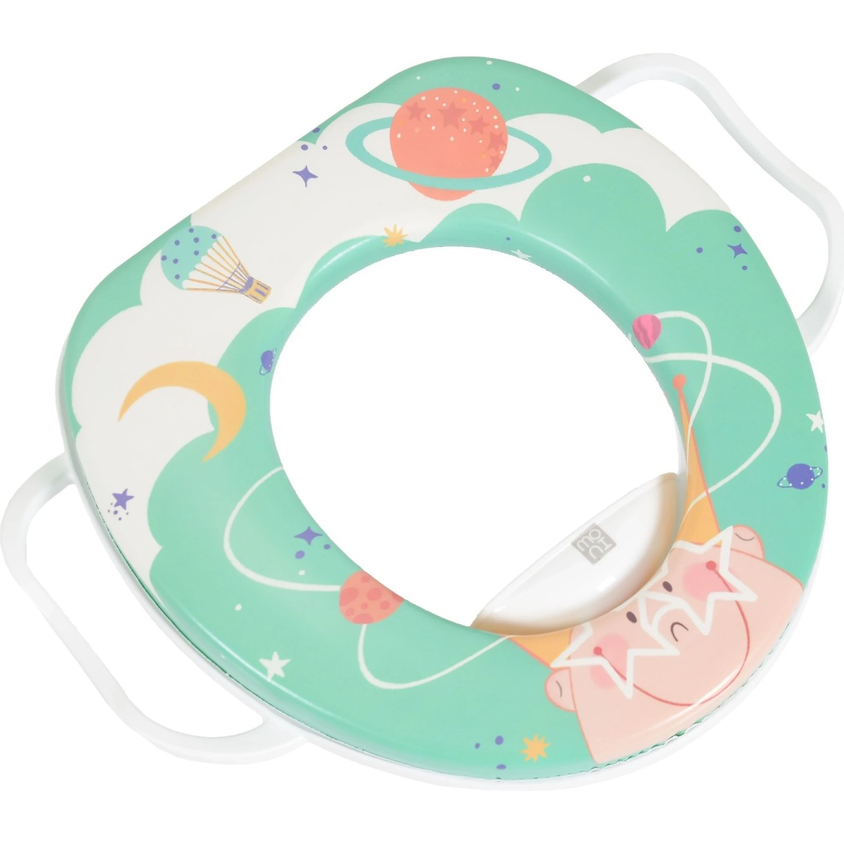 Designul vesel și atractiv Moni Wiggle transformă procesul de obișnuire cu toaleta într-o experiență pozitivă pentru copil. Scaunul se montează ușor pe majoritatea toaletelor standard, se scoate rapid și se curăță cu ușurință.