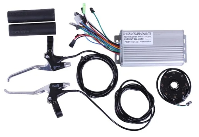 De asemenea, setul este echipat cu manete de accelerație/frână, care controlează pornirea sau oprirea motorului roții și afișează nivelul bateriei. Încărcătorul compact permite o încărcare rapidă și sigură, prelungind durata de viață a acumulatorilor. Gripurile asigură prinderea fermă a ghidonului, reduc vibrațiile și diminuează încărcarea asupra articulațiilor.