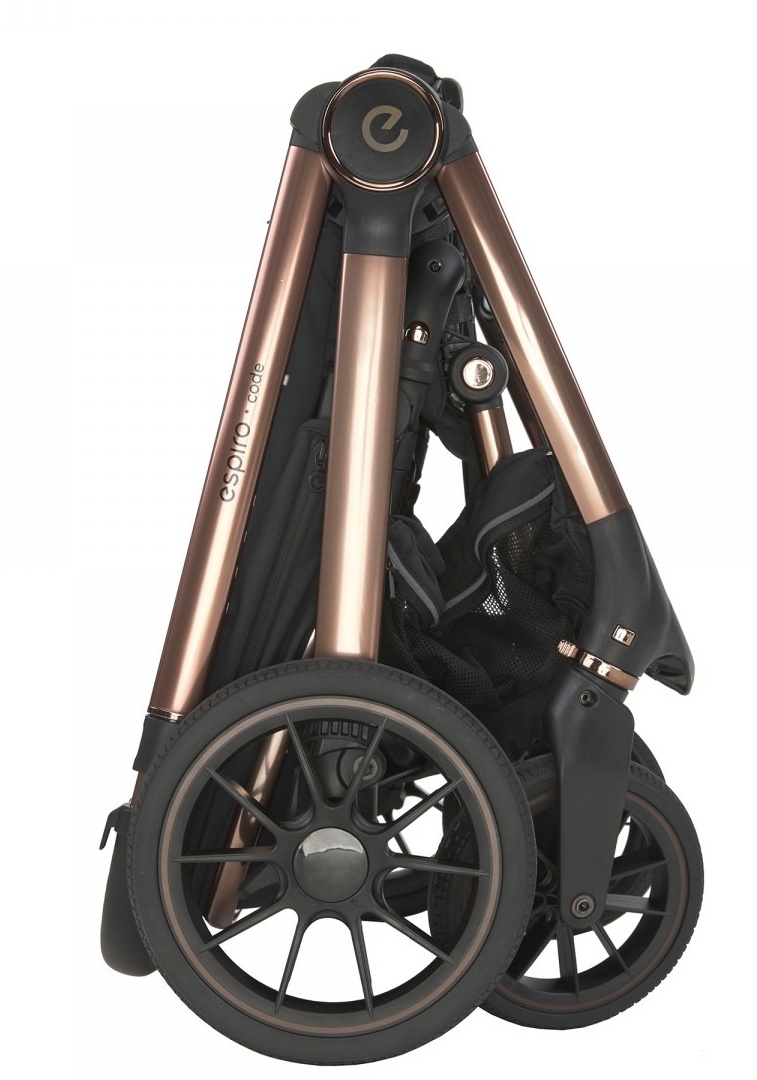 Șasiu Espiro Code: Ralierea cadrului cu un sistem automat de pliere. Fixarea în poziție pliată previne deschiderea accidentală a cadrului. Absorbție excelentă a șocurilor pentru orice teren. Roți din gel care nu necesită întreținere, fabricate din material EVA, acoperite la exterior cu un strat de cauciuc, îmbunătățind aderența și rezistența la uzură. Frână inteligentă, cu cheie de mers înapoi care nu deteriorează încălțămintea. Coș spațios cu o geantă de cumpărături suplimentară foarte mare și un buzunar închis.