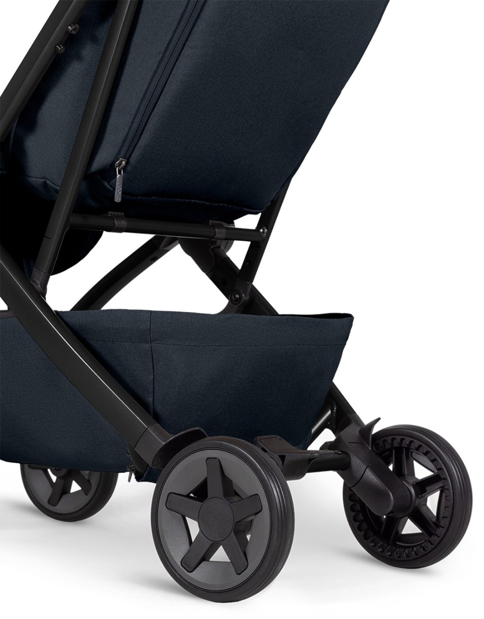 Joolz Aer2 alunecă lin înainte, fără a fi nevoie să vă efortați - controlați căruciorul chiar și cu o singură mână. Înălțimea optimă a mânerului căruciorului este de 105 cm - va fi convenabil atât pentru mămicile, cât și pentru tații înalți. Amortizarea șocurilor este pe toate cele 4 roți. Axul dintre roțile din spate este ridicat mai aproape de coș, ceea ce mărește spațiul pentru treaptă și reduce probabilitatea de a apăsa accidental frâna. Punerea căruciorului pe frână este destul de simplă datorită cheii mari care nu pătează încălțămintea.