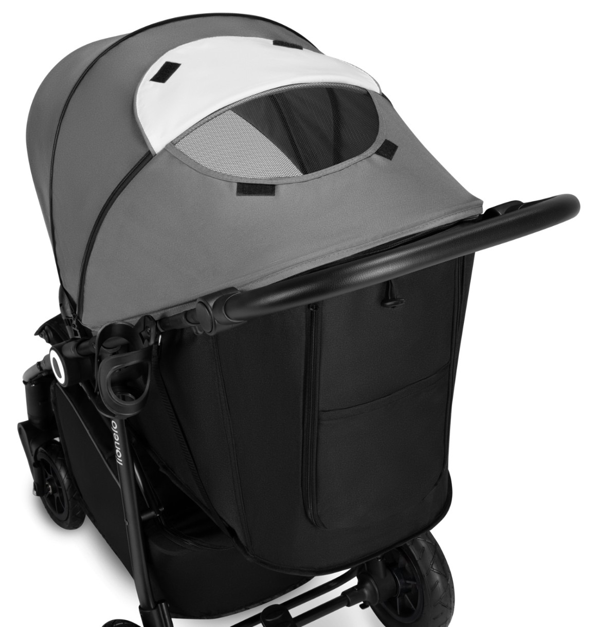 Pe partea din spate are o plasa transparenta. Bara de protectie este detasabila, cu o husa moale ce se poate scoate si spala. Cosul de pentru depozitare este spatios si are un buzunar la indemana.