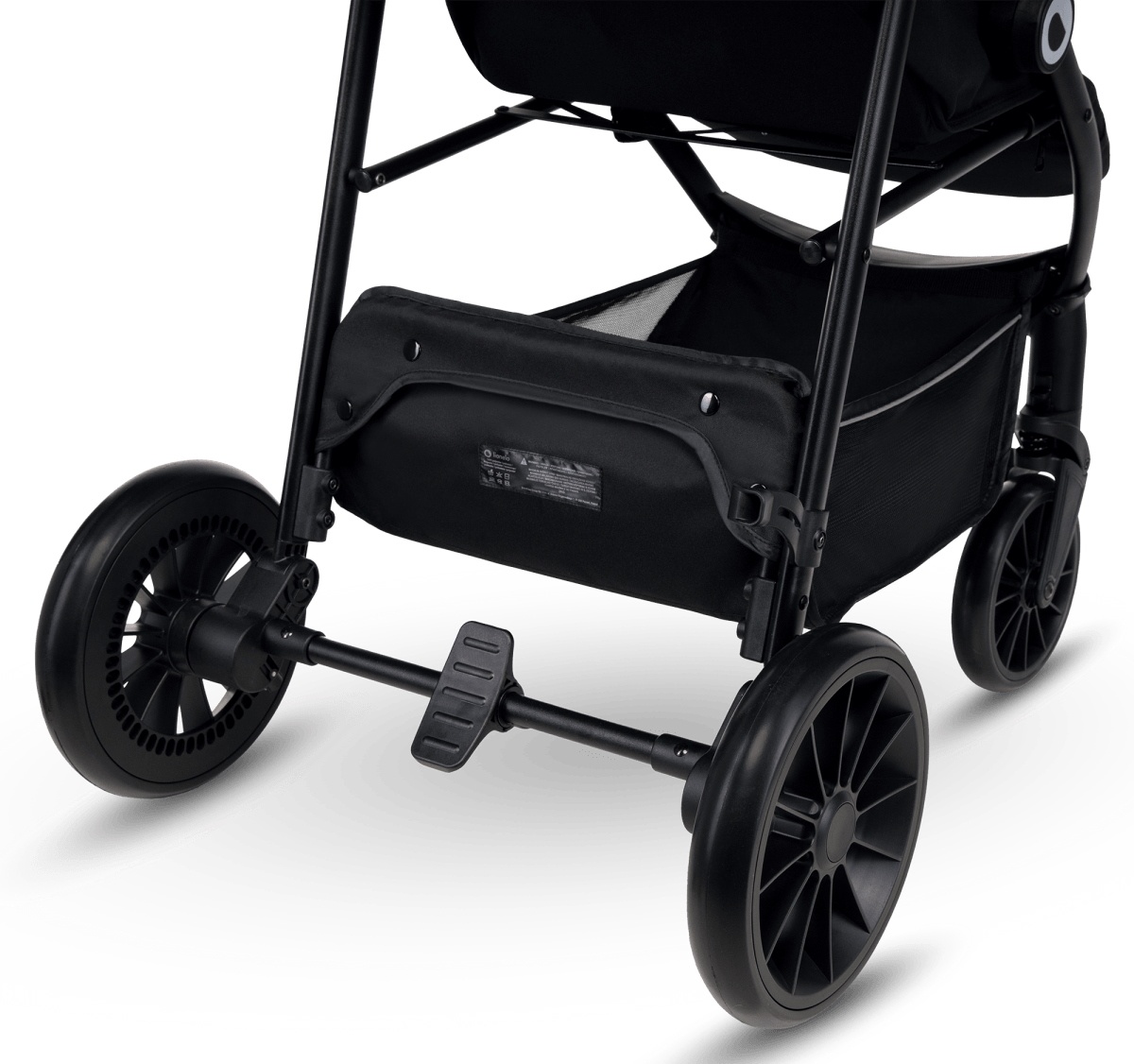 Roțile din față și din spate ale lui Lionelo Zoey sunt echipate cu amortizoare care minimizează eficient senzația de vibrație. Manevrabilitate ridicată și aderență bună a căruciorului sunt asigurate de roți mari rezistente la uzura din spumă poliuretanică EVA. Produsul este echipat cu o frana centrala, actionata de picior, si un blocaj suplimentar al directiei pentru conducerea in linie dreapta.