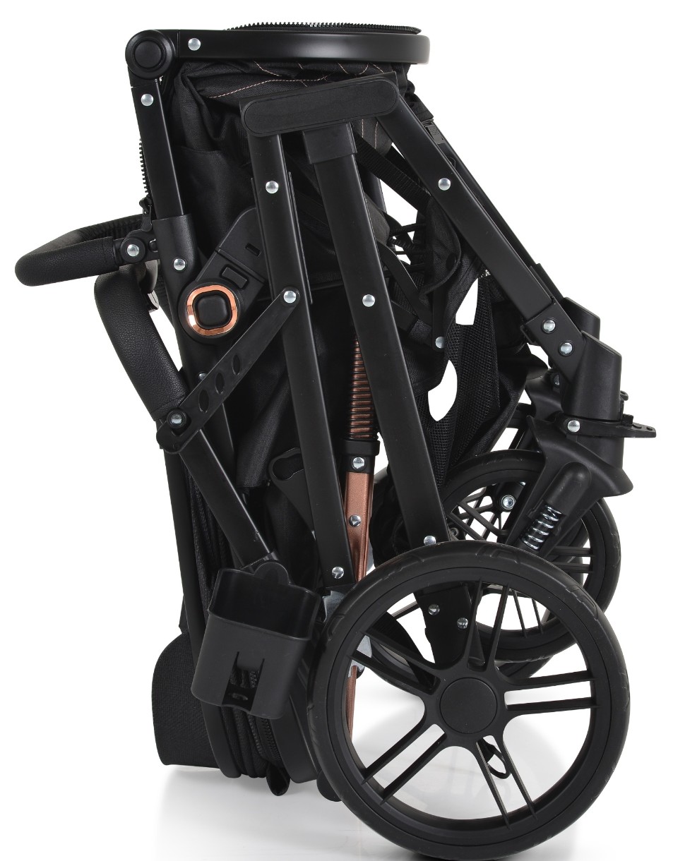 Cadru ușor din aluminiu. Pliere rapidă și ușoară a cărții. Rabatarea scaunului numai în sensul de mers. Scaun reversibil. Spătar reglabil în diferite poziții. Poziție complet în decubit dorsal. Mâner ergonomic din piele ecologică.